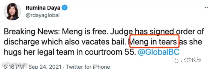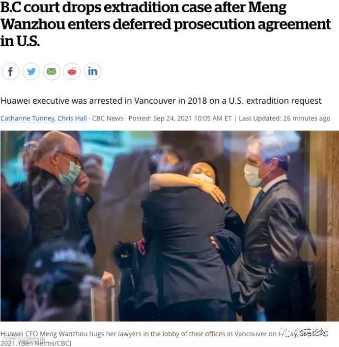 9 月 24 日中午,美国《纽约时报》以及加拿大媒体Global News ,孟女士已经和美国法院达成协议,美国检察官表示,如果孟女士遵守协议当中的内容,对她的所有指控都将会被驳回,为获释铺平了道路。