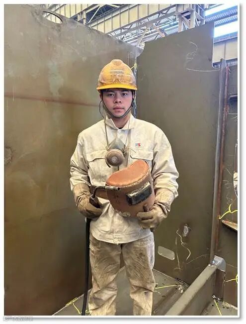 韩梦伟是公司首个在分段制造现场使用数字焊接机器的员工,他积极学习新技术,在张翼飞大师工作室和魏凤云大师工作室的指导下,经过不断探索,他总结经验编辑出一套操作手册,并将工艺方法传授给更多员工,提高工友工作效率,增强焊缝美观度,减少打磨工作量。