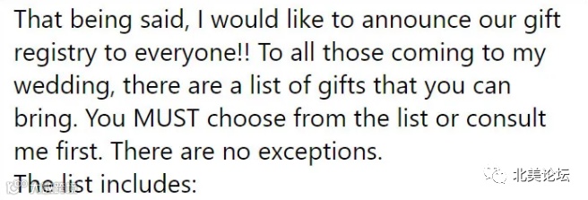 “正如你们看到的,我想要的礼物清单就是上面这一些。我希望每人所要送给我的新婚贺礼都不要低于400美元,我能够接受有一点点的金额差距但是你事先要与我商量一下。另外,附上一个链接,你们可以从这里查看别人已送了什么,请不要送重复了!