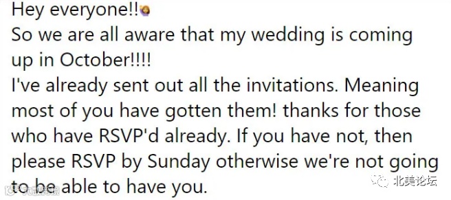 在大喜的日子来临之际,一名准新娘发布了这样一“大家好!相信各位都知道我10月就要结婚了!我已将全部的喜帖寄出去了,各位应该已经收到了!感谢那些回帖的人,如果还没有回帖的话,请在星期日之前答复我,以免我默认你将不出席我的婚礼。”