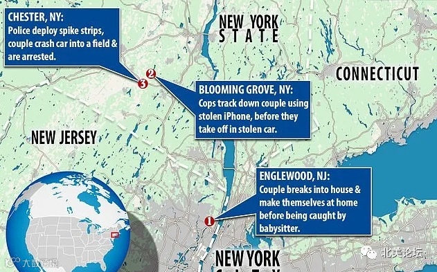 警察接到报案之后,通过房主被盗的iPhone手机进行定位,追踪发现这一对毛贼夫妇逃到了纽约州奥兰治县布卢明格罗夫,最后在宾夕法尼亚州切斯特市堵到二人,警察用钉刺带,让车失控冲进田里,这对雌雄双煞还不死心,竟然试图弃车逃窜,不过很快就被制服而且逮捕了。
