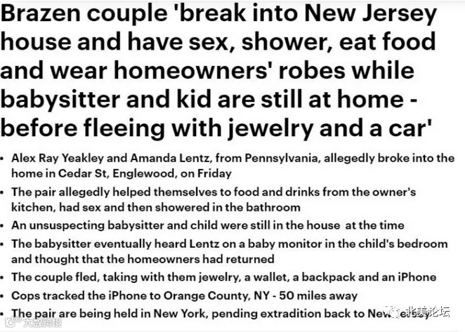 案件发生在新泽西州恩格尔伍德雪松街,那一带是相对比较富裕的街区。上个星期五的晚上,来自宾夕法尼亚州的雌雄双煞Alex Ray Yeakley与Amanda Lentz不请自来,偷偷溜进这里的一处高档住宅。