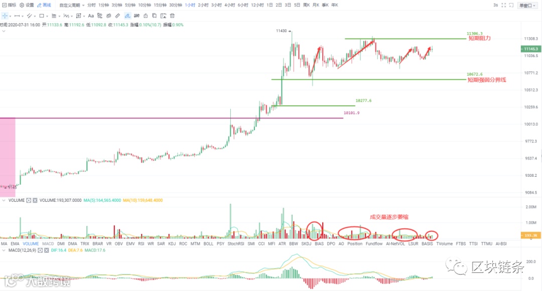 如图所示,在盘整的过程中,每次上涨多对应的成交量呈现出逐步萎缩的态势,说明现在依旧没有主力资金参与,这几天出现的小幅上涨军师散户资金主导,所以才没有持续性。不过这并不是关键问题,关键的是具有强弱分界线作用的10670始终没有被跌破,而且币价在高位的盘整还有些许抬高的现象,这说明整体的走势依然是多头主力在掌控着,盘整结束后继续顺应趋势上涨的概率更大。
