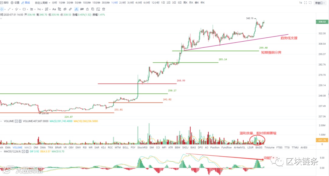 如图所示,现在各级别上涨格局都非常完好,再次拉升出新高时也有成交量放大现象,说明是有主力资金跟进的。不过从绝对量对比来看,这次成交量水平相比前一轮拉升时有明显萎缩。再加之动能指标MACD和币价之间有顶背离迹象(1小时级别),所以短期出现持续性上涨的概率较小,如果再次出现拉升反而容易出现冲高回落的走势,不宜再去追涨。