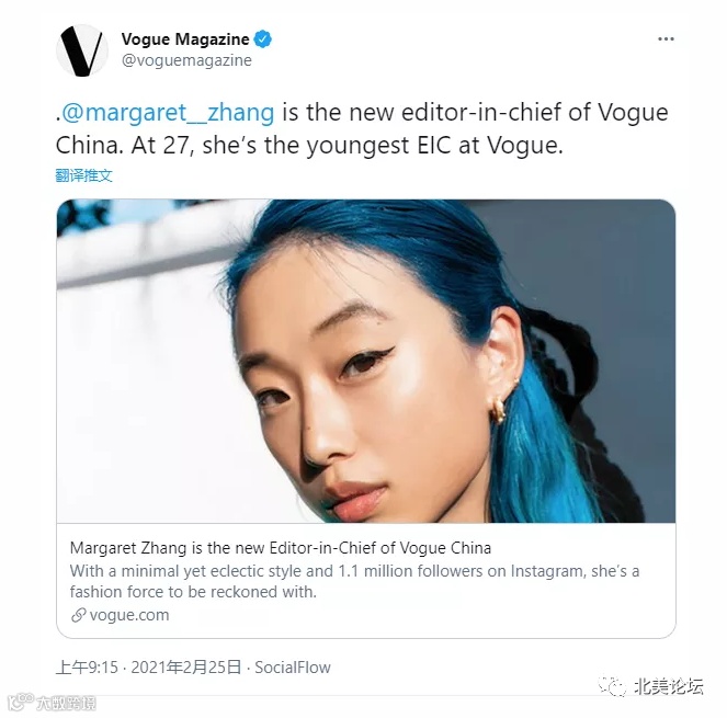 就在今日上午,康泰纳仕(《VOGUE》杂志的母集团)正式宣布将任命Margaret Zhang将接任张宇成为VOGUE中国版主编。