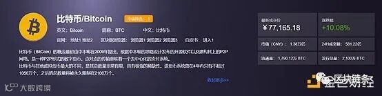 金色财经数据统计显示,最新成交价格为人民币77165元,涨幅10.08%,24H成交额为581.22亿。实际上,随着比特币价格的上涨,整体加密市场出现上扬行情。