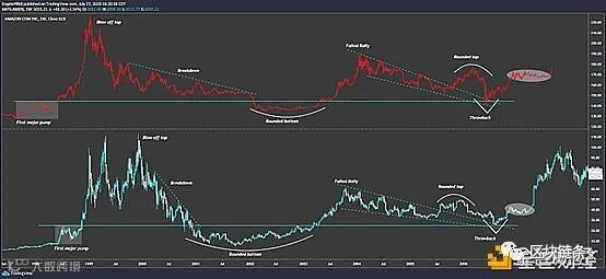 加密货币分析师Mr Chief在推特分享图表并指出,比特币自2017年高点以来的价格走势,与亚马逊(Amazon)从互联网泡沫到大衰退(Great Recession)期间的走势惊人地相似。该分形表明,到今年年底,比特币的交易价格将接近其历史高位,略低于20,000美元。