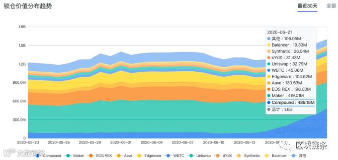 据DAppTotal.cn DeFi专题页面数据显示,截图来自DAppTotal,自6月15日开始,以Compound为首的各种DeFi项目锁仓价值趋势快速走高,其中Compound项目最为突出。截至6月21日,已统计的38个DeFi项目共计锁仓资金超16亿美元,其中Compound锁仓价值4.86亿美元,超越Maker的4.19亿美元,跃居DeFi项目第一。