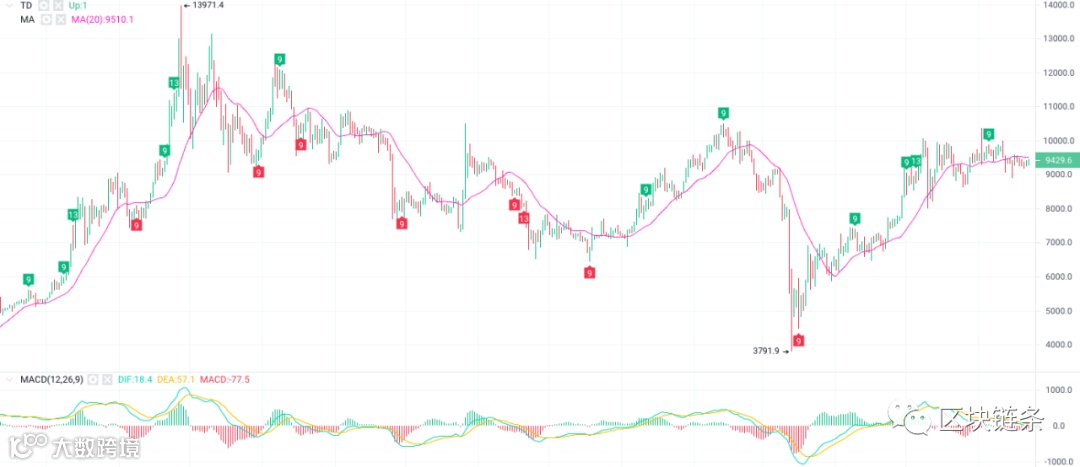 自6月12日,比特币价格跌破20日均线以来,连续多个交易日位于该均线下方运行,且从形态上看MA20处于水平,表明当前币市行情整体上仍为震荡市。指标方面,TD指标连续出现绿色序列9和13后,并于6月5日再次出现绿色序列9,说明近期行情的回调需求上升,上周币价的小幅回调也验证了这一点。下方MACD指标自5月中旬出现死叉后,并于6月上旬出现不死死叉,且快慢线位于0轴下方,表明当前市场情绪并未完全转空。