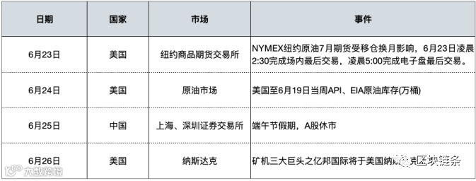 本周正值中国端午节假期,A股市场自25日期休市两日,外围市场方面,本周重点关注矿机三大巨头之一的亿邦国际本周五将于美国纳斯达克上市。