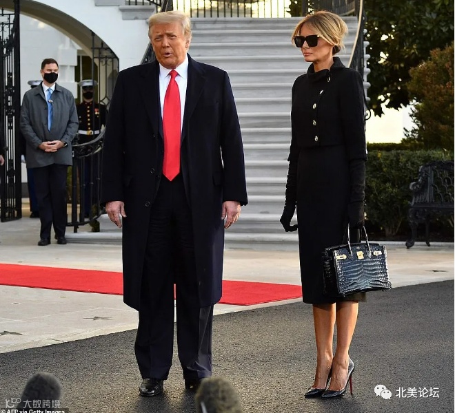 1月19号,和特朗普携手离开白宫时,她身着黑色香奈儿套装,手挎70,000美元的爱马仕黑色鳄鱼皮Birkin包包,脚踩一双Christian Louboutin红底恨天高。之后,这两位白宫前主人前往安德鲁斯联合基地,二位以总统和第一夫人的身份发表了最后一次演讲。