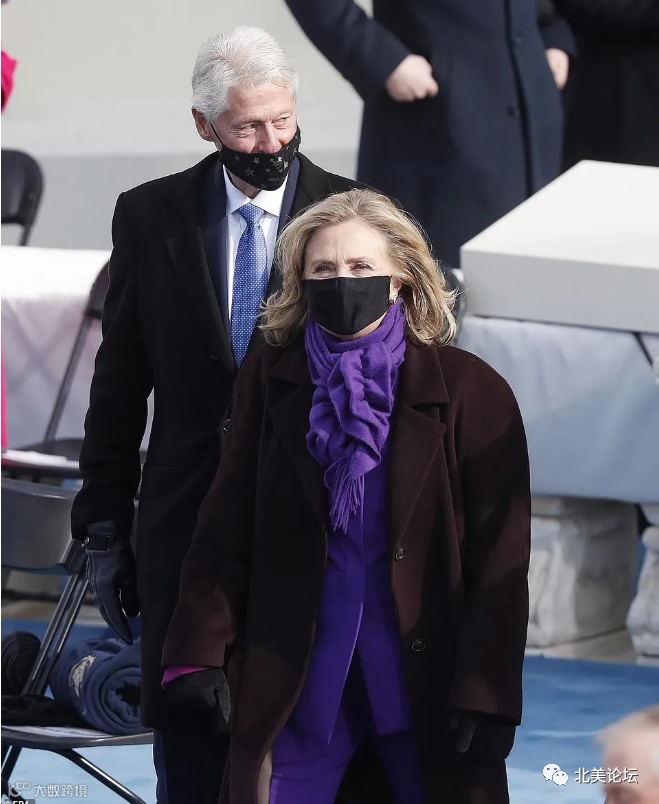 另一位前第一夫人,希拉里·克林顿也出席了当日的典礼仪式,她选择了一套紫色西装,搭配长裤以及围巾,外穿一件紫红色大衣与其相互照应。