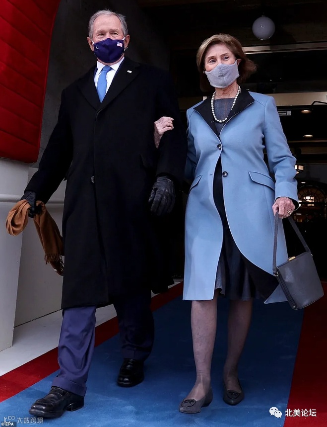 现年74岁的劳拉·布什也来到了现场,身穿浅蓝色上衣,搭配深色翻领和深灰色连衣裙,挽着布什,十分恩爱。