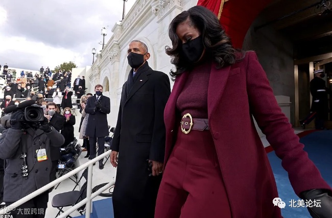 当天出席就职典礼的还有和拜登关系一直十分融洽的奥巴马一家。前前美国第一夫人--米歇尔·奥巴马选择了十分高贵的紫红色外套,搭配高领毛衣,高腰阔腿裤和金色腰带。