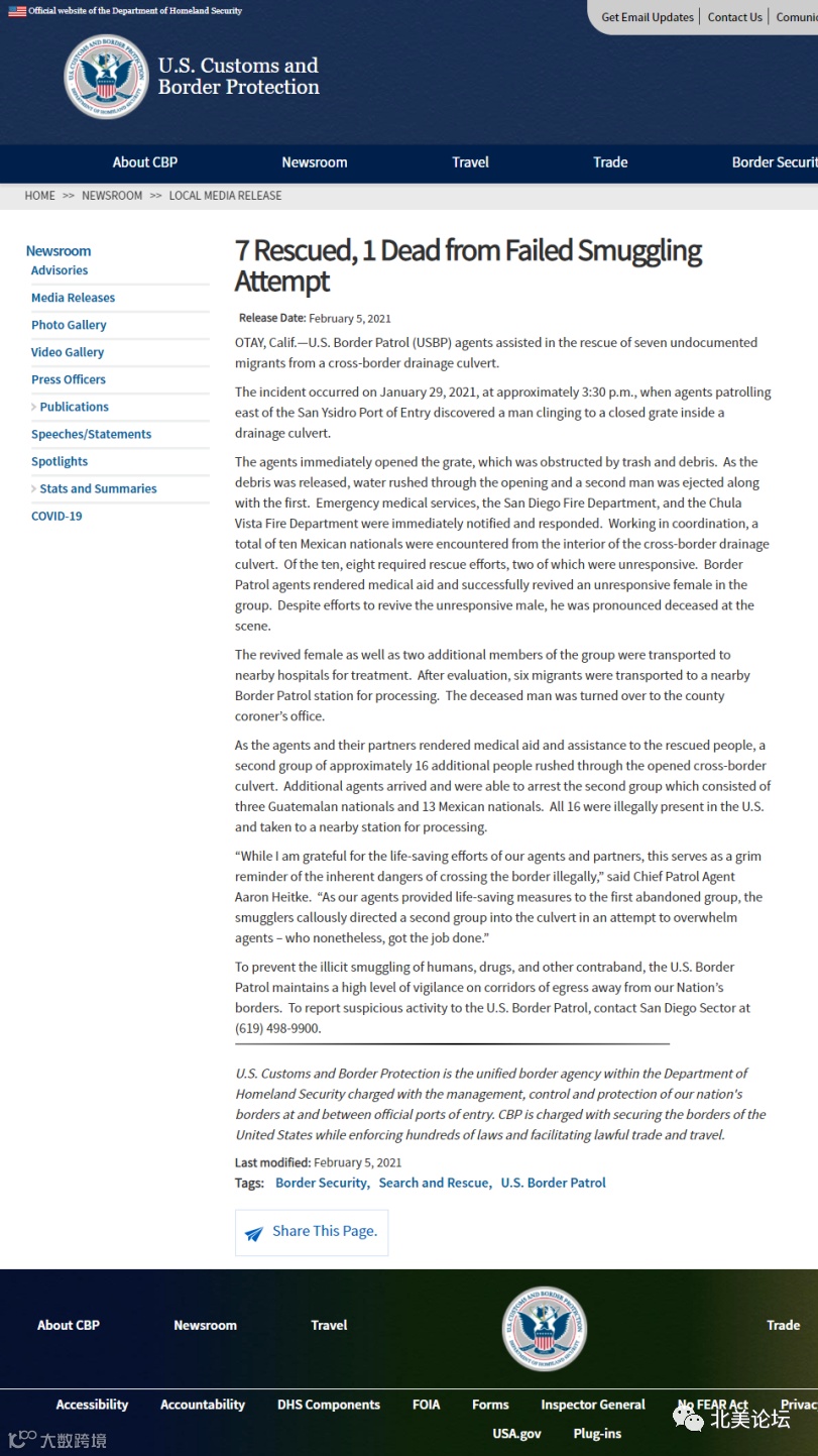 星期五,美国边境巡逻队发表了一份声明表示,1月29号执法人员发现边境一个封死的排水沟里面有人员活动的迹象,打开排水沟后发现有十名非法移民被困在里面,而且其中有一人已经确认死亡,其他的8个人则需要紧急救助。