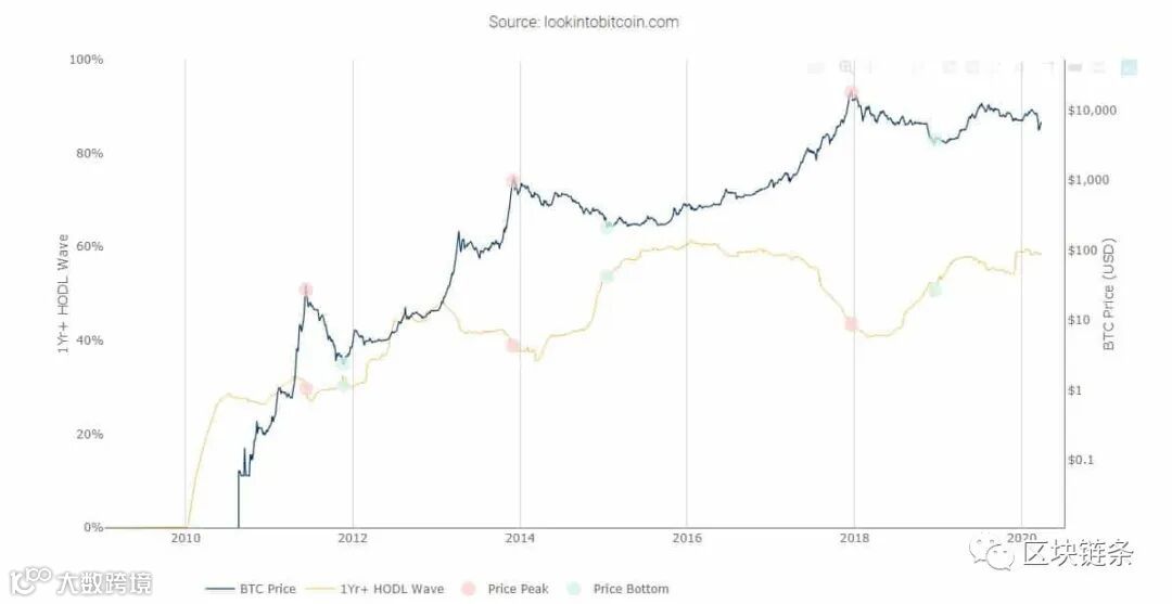 在其他一些特殊情况也是如此。如在2013年后期的牛市以及随后的价格跳水期间和 2017/2018比特币价格显著上涨期间。当比特币达到2万美元历史新高时,一年期HODL波动降至约40%。当价格在随后的几个月内触底时,波动又回升至55%以上。