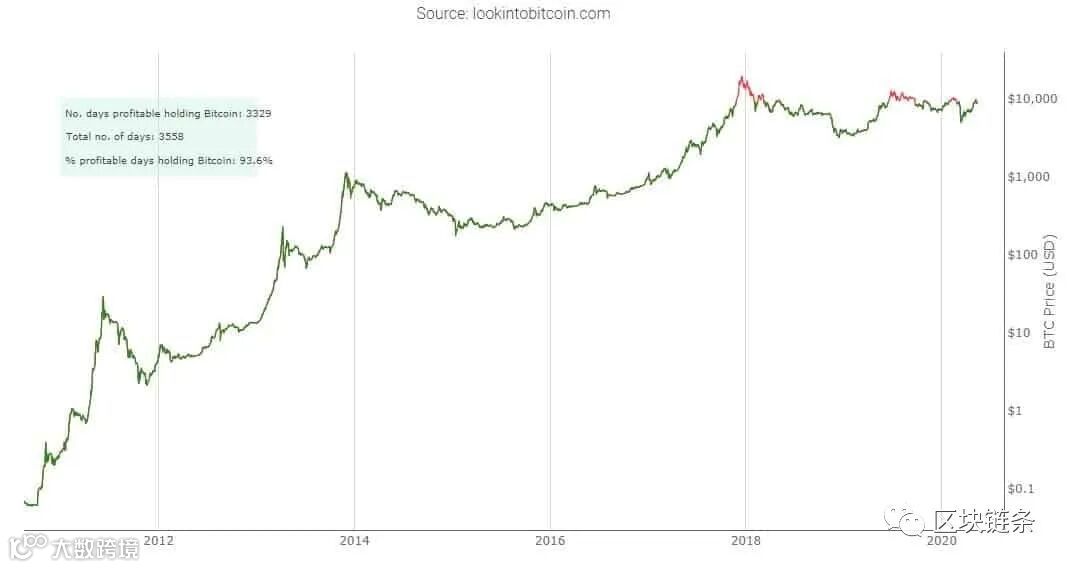 比特币盈利日期(绿色—盈利,红色—亏损),来源:LookIntoBitcoin