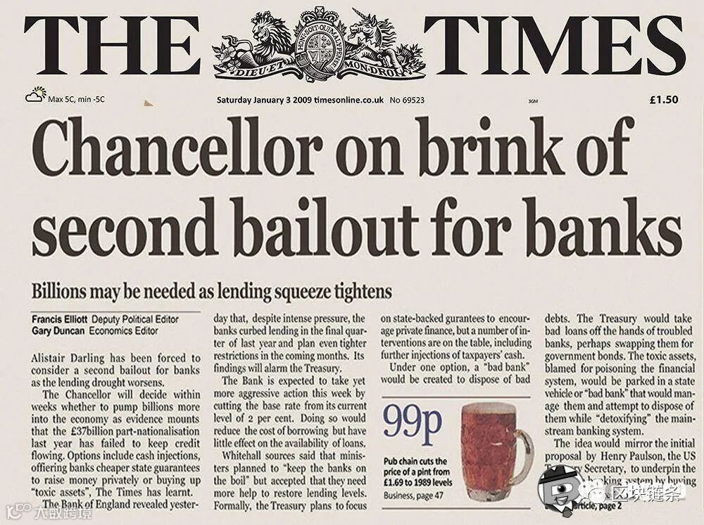 这句话是《泰晤士报》当天的头版文章标题,中文意思为“2009年1月3日,英国财政大臣正处于实施第二轮银行紧急援助的边缘。”伴随着这句话的是比特币的诞生。从某种意义上讲,比特币就是为经济危机而生。