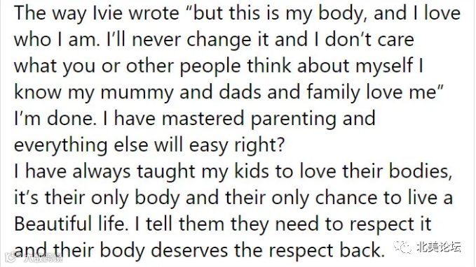 “我有4个孩子,我相信每个孩子都是独特的。我不想告诉他们遇到某件事必须怎么做,希望她们可以有独立思考的能力。但是我确实偶尔也担心我的教育不到位。当我看到lvie解决这件事时,她面对这些言语伤害时,我明白我有把我的孩子们教育好!”