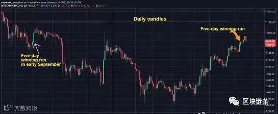 如上图所示,比特币近5日连续收阳后下挫,而2019年8月30日至9月3日时也发生过相同情形。当时,比特币从9,350美元低点连续5日上涨,最高站上10,783美元,随后开始震荡走弱,并于9月中旬后有大幅下跌。