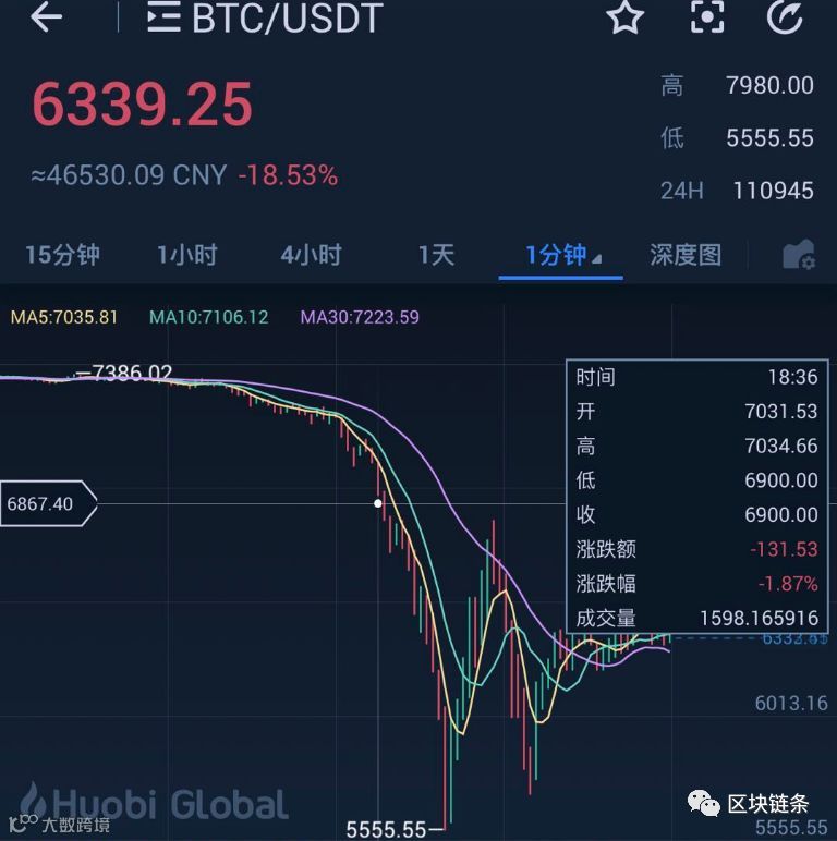 在连续半个小时的时间内,BTC跌幅超过20%。18.47时,一根跌幅5.44%的大阴线,直接将价格跌下了5555.55美元,相比于2019年第一次涨幅的价格,在比特币产量没减半前,价格已经减半。