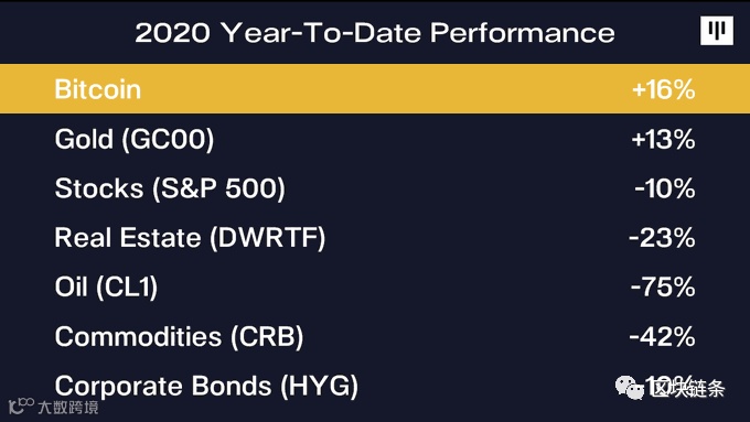 比特币爱好者经常吹捧BTC是下一个在全球范围内使用的大型投资工具,它比黄金和股票等传统投资更受青睐。Pantera Capital首席执行官Dan Morehead在2020年4月29日报道说,这些爱好者有理由庆祝该加密货币在年初至今的表现已超过黄金。自2020年1月1日以来,比特币的增长率为16%,而黄金的增长率为13%。