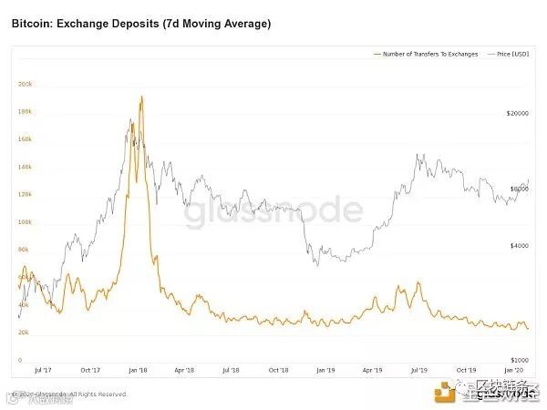 在2017年比特币价格新高时,比特币交易所存入资金笔数超过了比特币价格,Glassnode记录的每日交易所充值约为20笔。