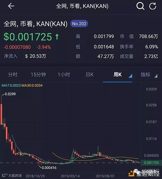 币看平台于去年6月13日上线KAN,上线第6日触及0.0299美元的最高价,随后一路下跌,目前相比首日开盘价跌去了90%。