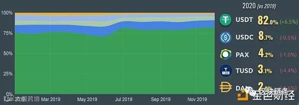 2019年只有USDT的占比在增加,前五大稳定币中的其他四家如USDC、PAX、TUSD、DAI市值占比下降,其中TUSD市值占比下降最大,被PAX超越。GUSD更是退出前五大稳定币行列。