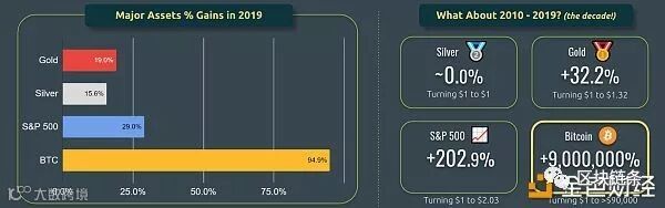 报告还比较了这四种资产在2010年-2019年整个2010年代的表现,毫无疑问,比特币是2010年代表现最好的资产,收益率更是高达90000倍。
