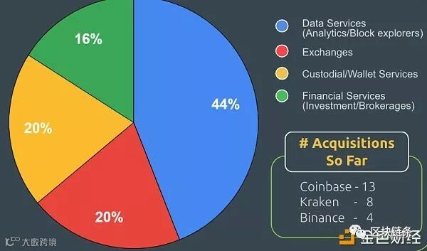 自2013年以来,加密货币行业共进行了350笔交易,价值超过40亿美元。加密货币领域中三个最大的收购方:Coinbase,Kraken和Binance。