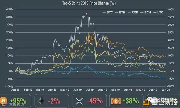 市值前五币种中,比特币的表现最好,2019年全年涨幅为95%。其余四个币种涨幅分别为ETH(-2%)、XRP(-45%)、BCH(%38%)、LTC(+37%)。2019年市值前五币种平均涨幅约20.6%。