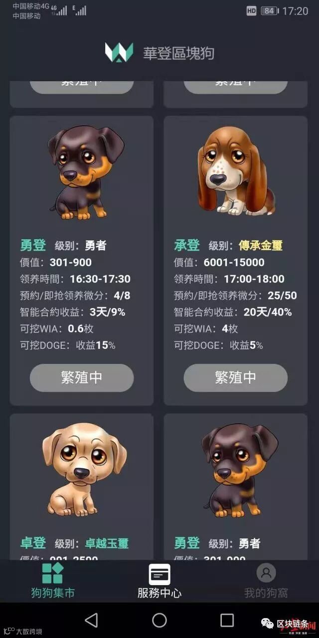 在“华登区块狗”APP平台上,区块宠物狗有5个品种,价格在100-15000元之间,用户注册认证并激活账户后,通过预约并匹配成功后支付押金,领养心仪的狗狗,等到规定的时间进行交易,获得相应的收益。