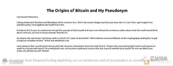 “伪聪”的文字多用连句,两个或两个以上的主句或独立的子句连接在一起,却没有过渡或正确的标点符号承接。相比之下,白皮书则写得很好,结构合理,流畅地对比特币的点对点网络进行了技术解释。