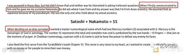 如上图所示,“伪聪”在文章中称Hal Finney是给了他别名中本(Nakamoto)的人。然后,就在紧接着的一段话里,“伪聪”又来了个180度大转弯,他写道:“当我决定起一个别名的时候,我想要一个主数字命理学的名字......”