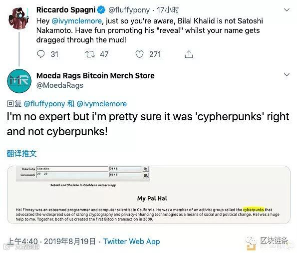 另一方面,比特币爱好者们很快就注意到“伪聪”在拼写“密码朋克”一词时,错误地使用了“Cyberpunks”而非正确拼法“Cypherpunks”。而中本聪最早就是在名为“Cypherpunk”的电子邮件系统中分享了比特币的白皮书,很多密码朋克都订阅了这些白皮书。