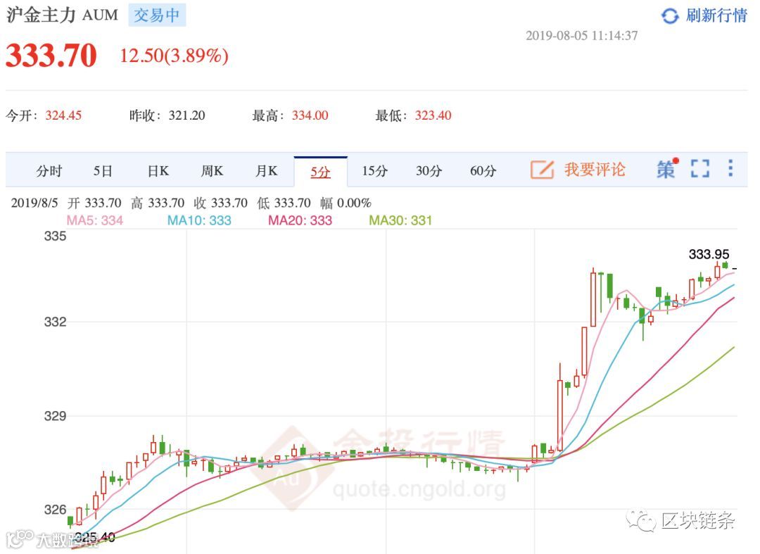 人民币大幅贬值的同时,港股恒指低开1.63%,随后跌幅扩大至3%,逼近26000点。作为避险资产的黄金则震荡上行。国内期货沪金(上海黄金交易所延期交付Au(T+D)的一种俗称)主力价格上涨3.89%,暂报333.70元/克。国际黄金今日也小幅上涨,今日最高价报14656.2美元/盎司。