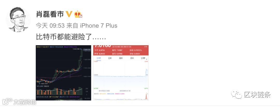 财经专栏作家肖磊在微博上晒图,并表示,比特币都能避险了……
