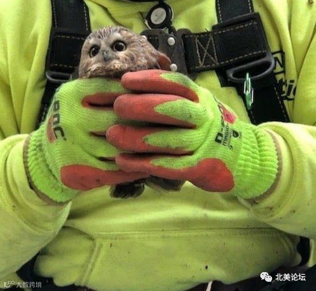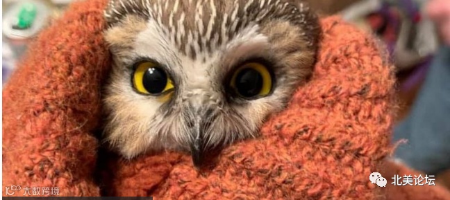 人们在纽约洛克菲勒中心的圣诞树上救下一只磨锯猫头鹰,目前它正在纽约州的野生动物保护区休养恢复。