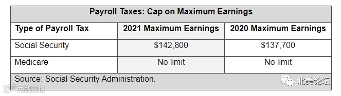 这也是明年社会安全金最大的变化之一——增加工资税收上线。从今年(2020)de $137700上升到了$142800。虽然社安税的缴纳设置了上限,但这一变化也意味着美国更多的高收入人员将为此缴纳更多税款。