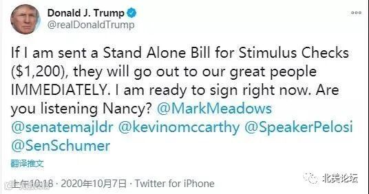 几个小时之后,在推特上,川普又一连发布了几条帖子,其中他表示,签署独立的刺激措施法案他是愿意的。
