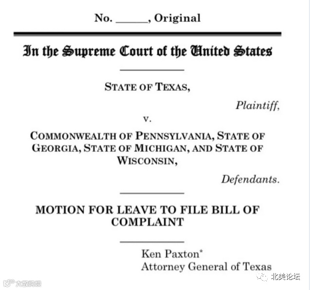 这份诉讼由德州检察长肯·帕克斯顿向最高法院提起诉讼,起诉宾夕法尼亚州、密歇根州、威斯康星州和乔治亚州,在今年的大选中,州长以新冠病毒肆虐为由,大幅增加邮寄选票的占比,这违反了宪法第一条。