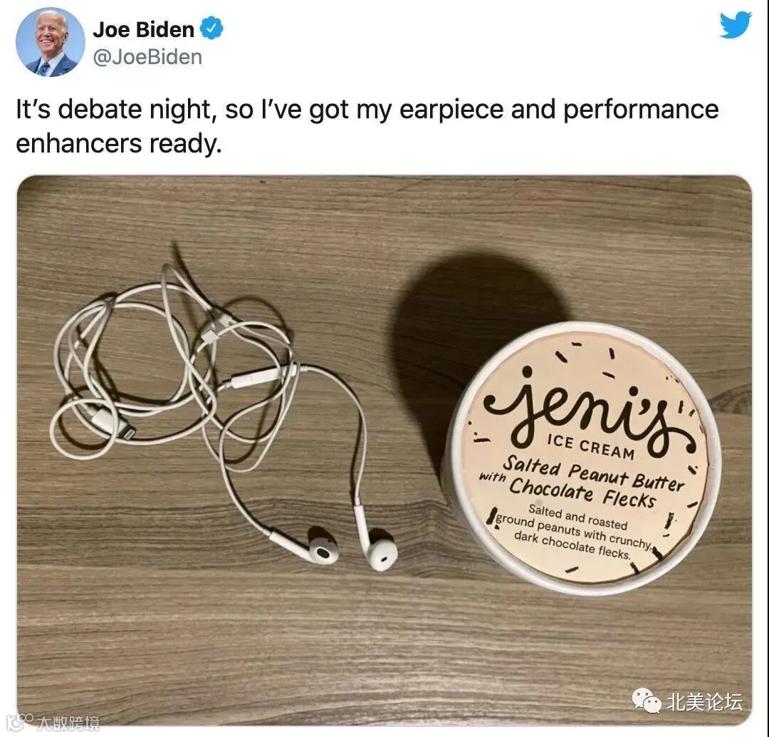 之前拜登,将全美新冠死亡人数误报,将死亡人数说成2亿多人,事实就是全美也就才3亿多人,最重要的是他曾经还把伊拉克和伊朗搞混。这老兄确实有点不给力,这不被川普逮着了。川普因此质疑拜登(拜登比川普年长3岁)的精神和身体状况,并他承担起总统的重任的能力表示怀疑。最讽刺的是,在辩论开始前,川普打趣拜登,说这次辩论拜登需要有药物和秘密耳机支撑。拜登倒是没小家子气,开场前po了一张照片(照片上是一根有线耳机和一盒冰淇淋):“哈,耳机和秘密武器已经准备好了”。哎,还真是小孩子的对白。