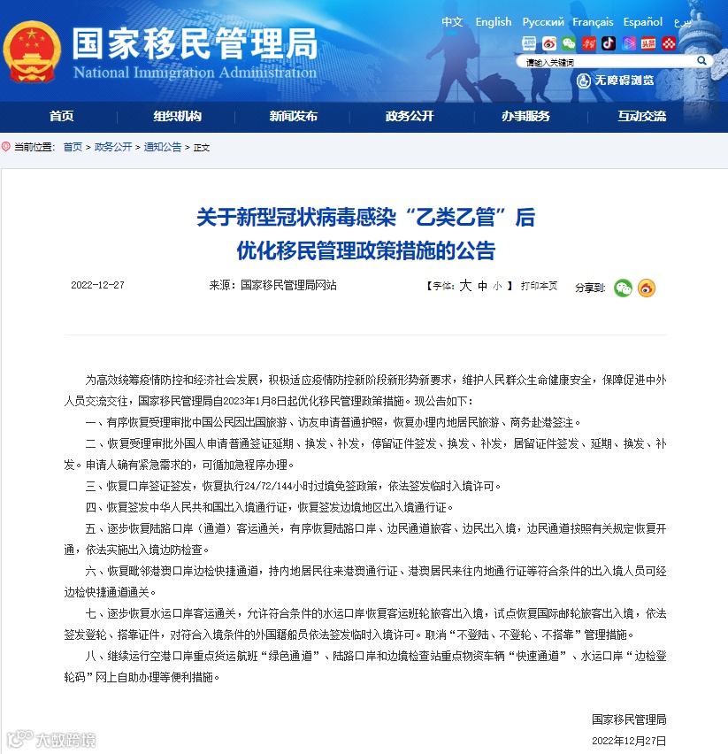 中国国家移民管理局12月27日发布公告,自2023年1月8日起优化移民管理政策措施,有序恢复受理审批中国公民因出国旅游、访友申请普通护照。