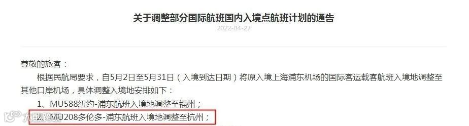 加拿大直飞回国的东航航班只有MU208多伦多-上海这一趟,将继续维持4月的操作,改为杭州入境。