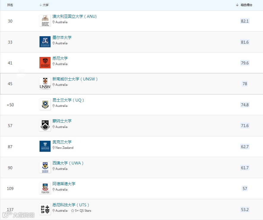 本次的排名中,澳大利亚共有6所大学跻身世界百强,排名最高的是澳大利亚国立大学。新西兰排名最高的大学为奥克兰大学,世界第87。