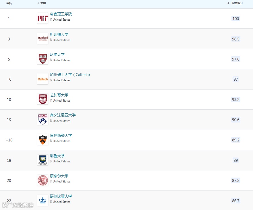 美国的高校包揽了北美地区前十名,其中斯坦福大学、哈佛大学、加州理工大学、芝加哥大学跻身世界前10名。