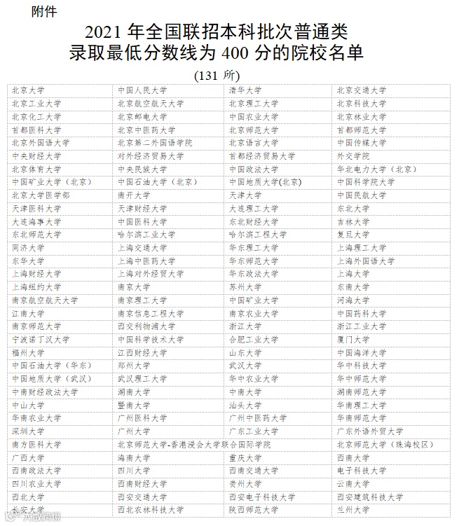 (一)普通类院校(专业)文史、理工类:300分(其中,部分院校执行400分,400分院校名单见下图);