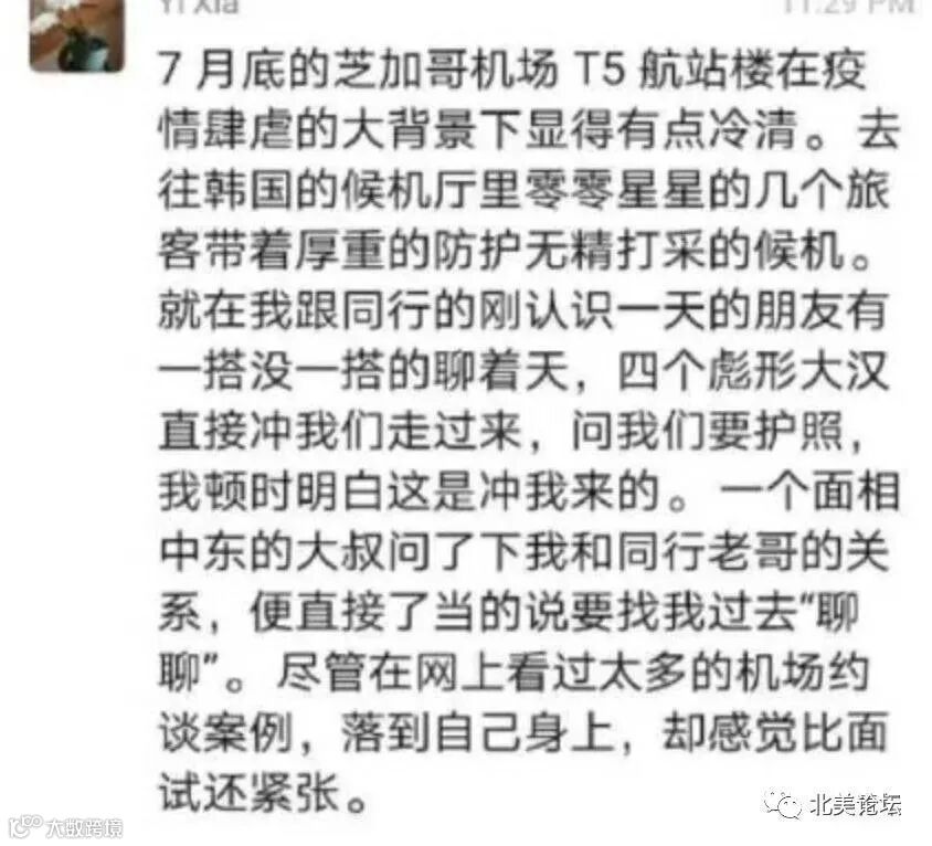 这位网友表示上个月底他买到了从芝加哥转韩国再回国的机票。当他到达芝加哥机场候机楼时,4名工作人员无厘头的表示要检查他的护照并让他去“聊聊。”