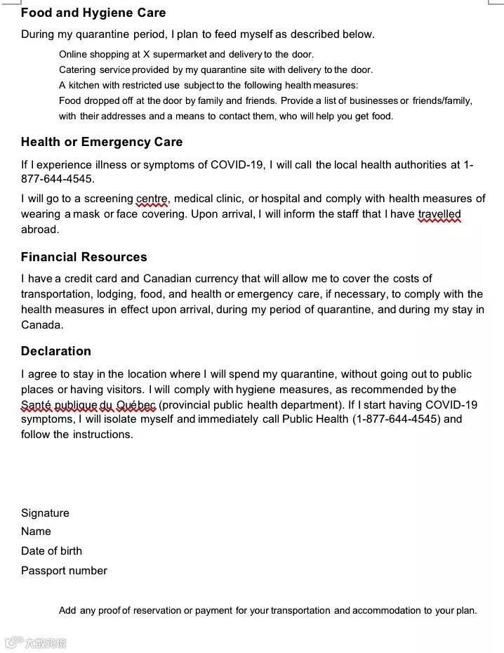 入境加拿大的旅客必须提前准备14天隔离计划,以防万一您的疫苗接种证明不合规。隔离计划需要包括: